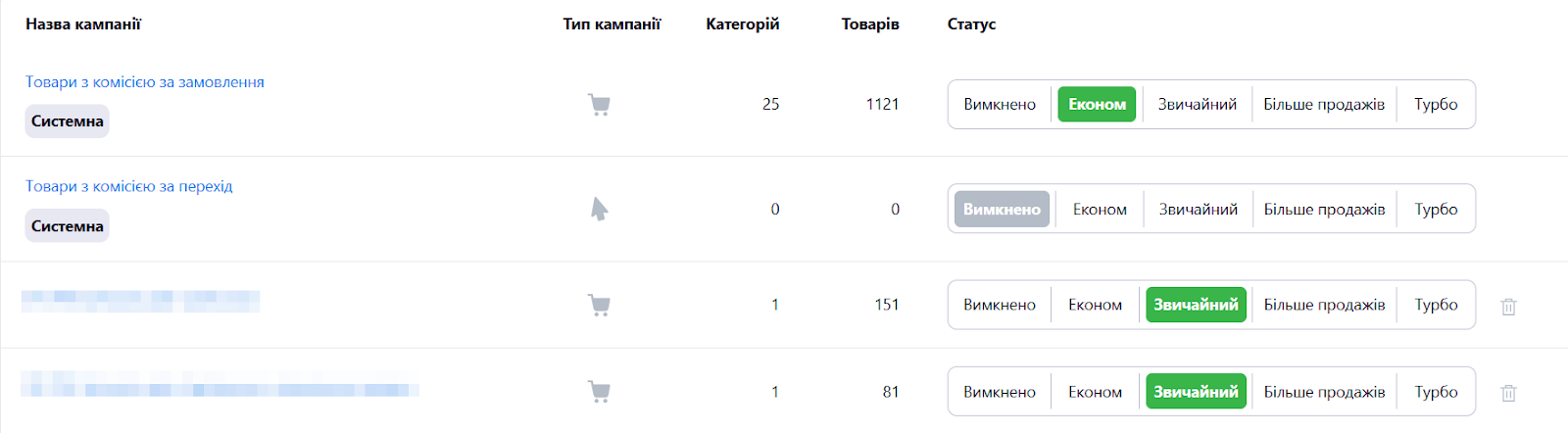 комісія* стягується відповідно до налаштованого продавцем режиму кампанії (режими «Економ», «Звичайний», «Більше продажів» або «Турбо»)